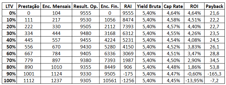 No quadro abaixo pode ainda ver diversos resultados para o investidor em função da variação do LTV: