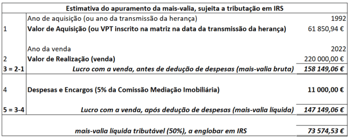 Por hipótese, nesta reflexão, para simplificar, considerei a situação de um contribuinte, categoria A, trabalhador por conta de outrem, que realiza a venda de um imóvel, pelo valor de 220.000,00€, uma herança de família em que é o único herdeiro, com valor patrimonial tributável de 61.580,94€ (valor declarado na relação de bens).