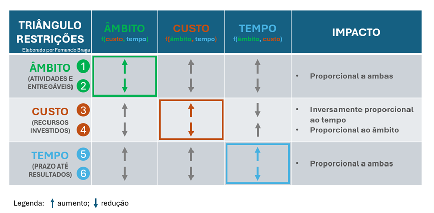 A tabela abaixo demonstra como as demais restrições devem ser ajustadas sempre que uma ou duas delas são alteradas durante o projeto: