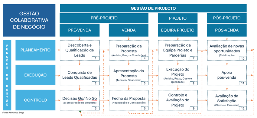 A Gestão Colaborativa de Negócio desenvolve-se através de uma sequência estruturada de atividades (ver numeração indicada no esquema), suportadas em diversas funções de gestão realizadas de forma articulada entre diferentes níveis organizacionais que, no âmbito das suas responsabilidades, contribuem de forma complementar para a criação de valor na gestão de projetos.