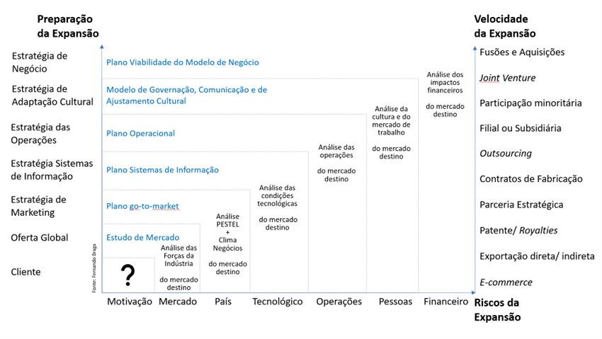Existem três dimensões interdependentes que determinam, na prática, o sucesso ou o fracasso da expansão internacional: o nível de risco assumido, o processo de preparação e a velocidade da expansão.