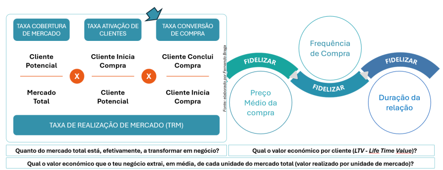 - Qual o valor económico que o negócio extrai, em média, de cada cliente do mercado total (valor realizado por unidade de mercado)?